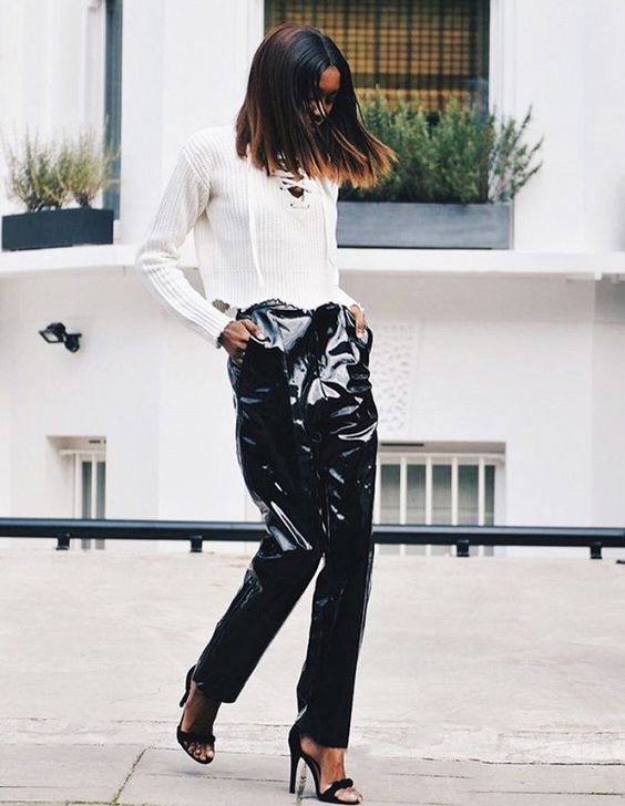 De combinatie waar we het over hebben is de vinyl broek in combinatie met een sweater. Zelf ben ik he-le-maal weg van deze combi omdat de vinyl pants nogal heftig is en deze look dan wordt gecompenseerd met een rustiger, klassieker item. Zo creëer je een waanzinnige look. Sneakers eronder en it-bag ...
